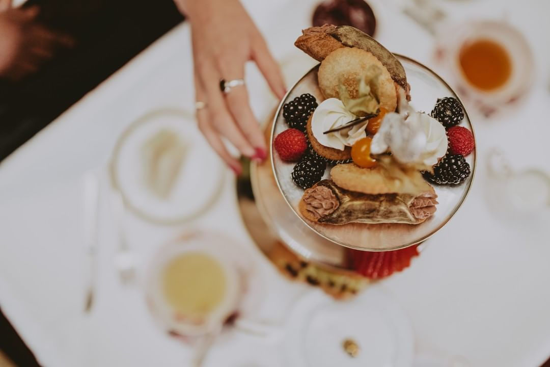 A spectacular three-tier silver platter overflowing with treats arrives at the table. I start with the freshly-baked scone, still warm and studded with jasmine-tea infused golden raisins and paired with strawberry jam, crème fraîche and light-as-air whipped butter. Other sweets include macarons, buttercream-topped chocolate cake, ginger cookies and an oat-crumble berry tart. Talk about a royal lineup.